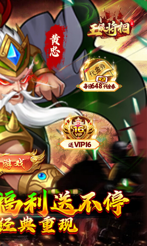 《王侯将相(0.1 折日送双倍 648)》,这是一款竖版挂机三国手游,游戏内容丰富多样,福利突破上限!每日签到免费领 648 代金券,体验感拉满!代金券任意充值,再送 648 代金券,让你体验飞一般的感觉。上线保送VIP16 ,额外再送 5 亿铜钱与 1 亿元宝,助你轻松开启三国霸业。不肝不氪,挂机和快速作战有收益。打怪挂机得 GM 直充卡,兑换 GM 余额,在 GM 修改器免费领更多奖励 。如此良心的三国手游,你还在等什么?快来开启你的三国之旅吧!!